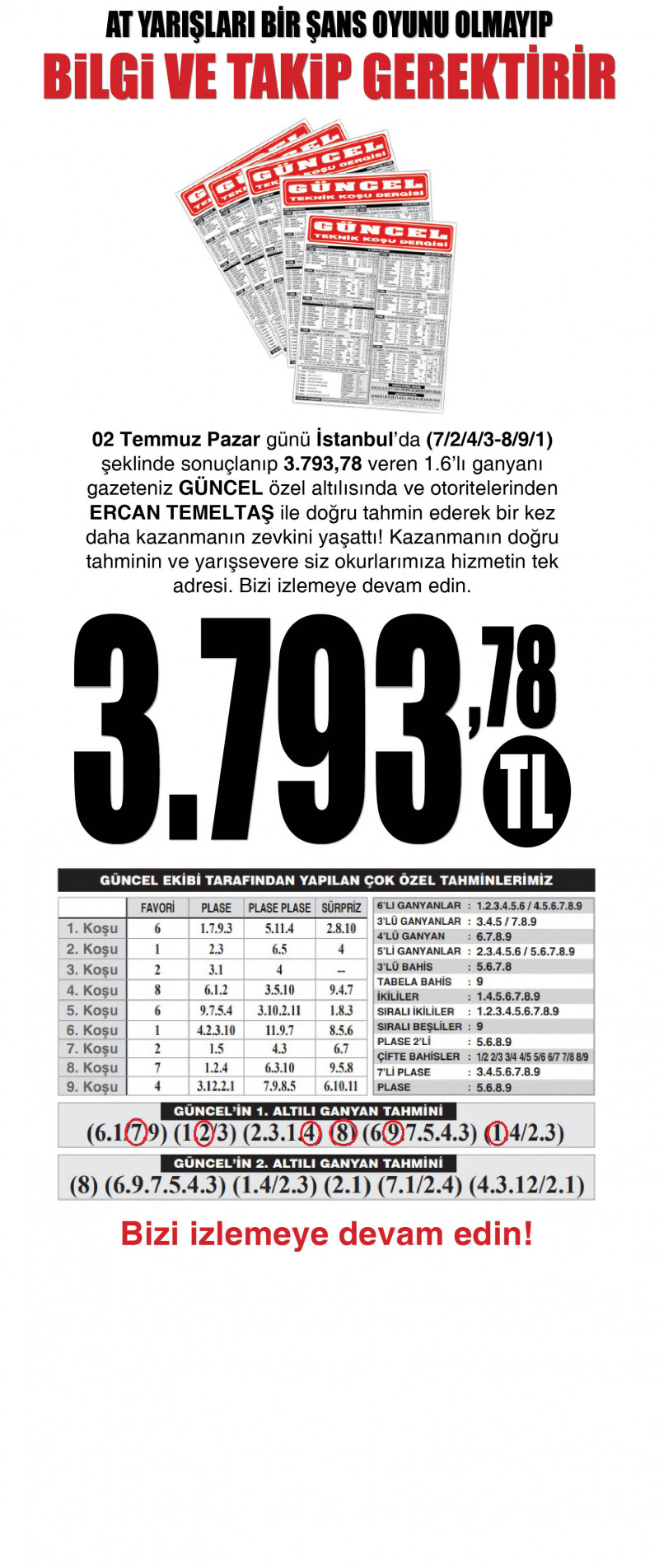 1.Ayak: Jokeyi F.Yardımcı ile (5) JET İSO bu rakipleri arasında ilk şansı almayı hak ederken, (8) AL CELİM son haftalardaki yükselen formuyla rakibidir. 1200 kumda Maiden kazanan (9) FARALİNA yine güven verirken, (2) FLY AWAY Şanlıurfa 1700 kumunda kazanıp formunu sürdürmesiyle adından söz ettirebilir. (7) IMMORTAL KNIGHT ile (3) ALDOR bana göre şansları yüksek olan diğer safkanlardır.