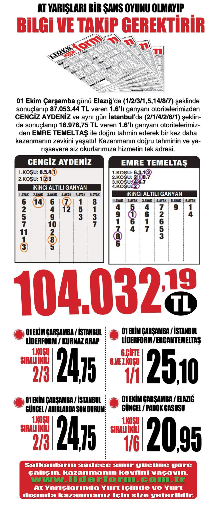 At Yarışlarında sınır sistemi ile kazandırmaya devam ettik. Elazığ da 87.0.53.44 TL ve İstanbul 16.978.75 TL'lik 6'lılar