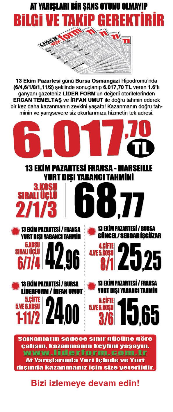 12 Ekim Pazar günü İSTANBUL ADANA'da yapılan yarışlarda bir sonraki koşularında takip edilmesi gereken safkanlar