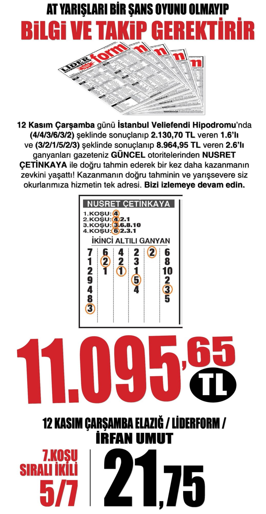 11 Kasım Salı ADANA- KOCELİ'de yapılan yarışlarda bir sonraki koşularında takip edilmesi gereken safkanlar