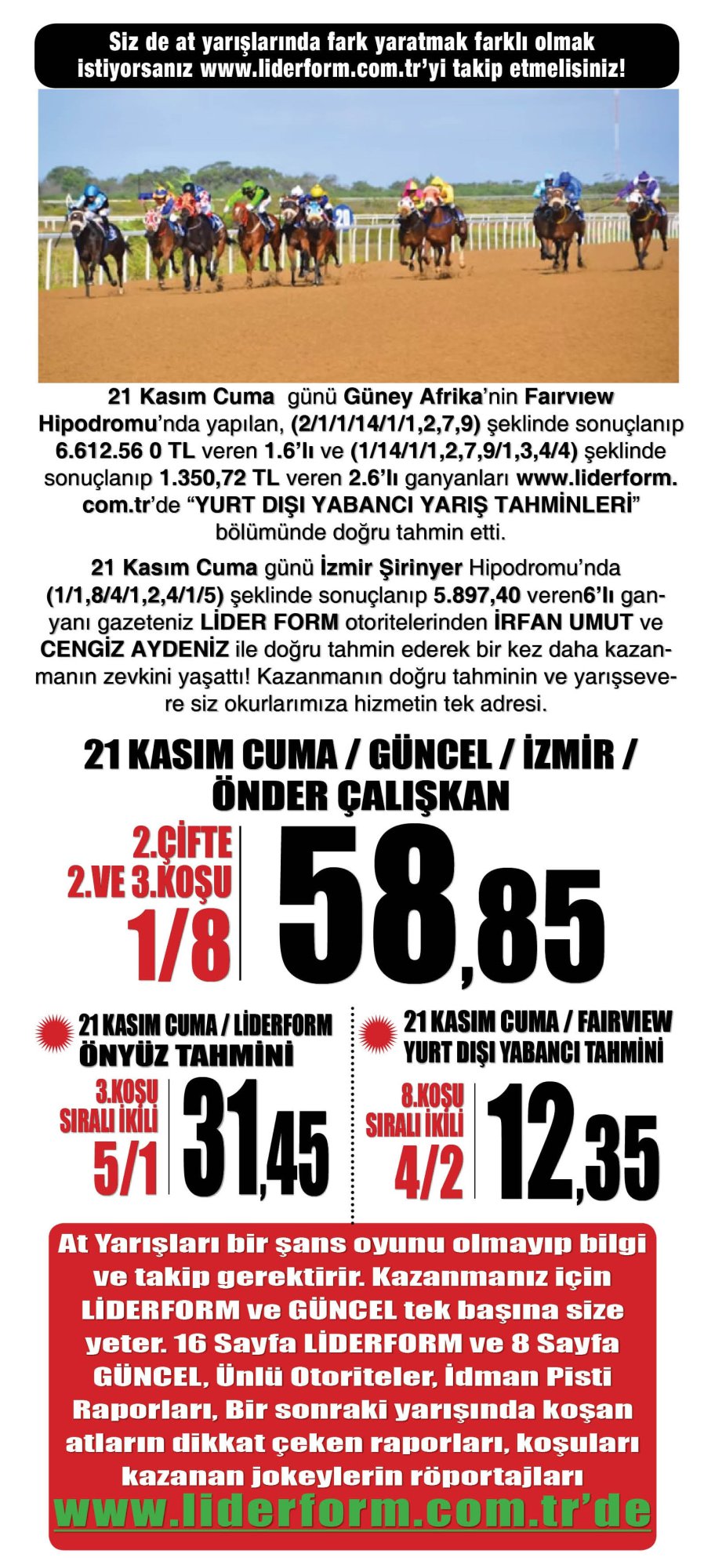 20 Kasım Perşembe İZMİR ANTALYA'da yapılan yarışlarda bir sonraki koşularında takip edilmesi gereken safkanlar