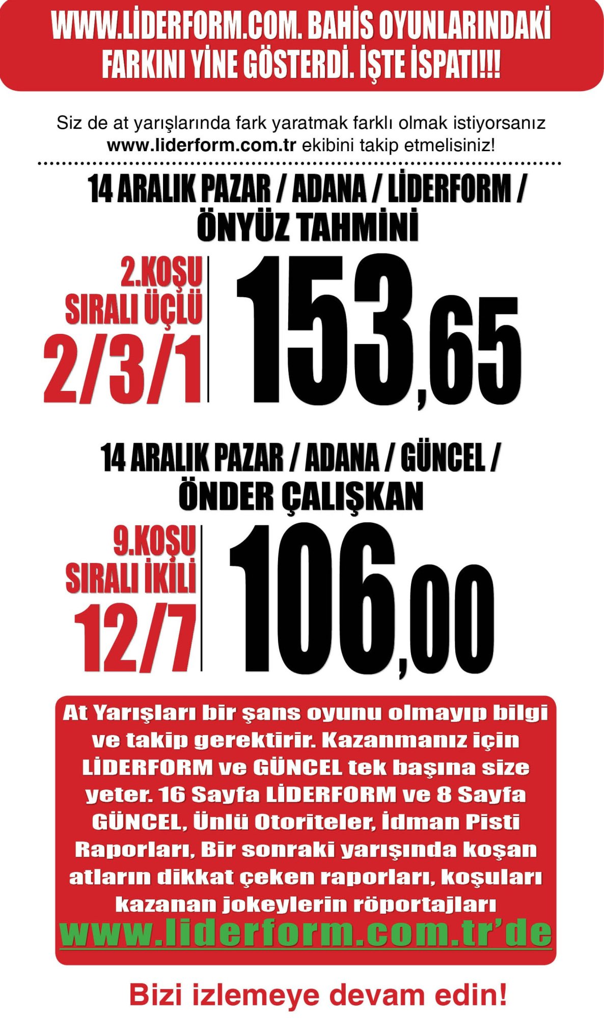 13 Aralık Cumartesi İSTANBUL- ADANA'da yapılan yarışlarda bir sonraki koşularında takip edilmesi gereken safkanlar