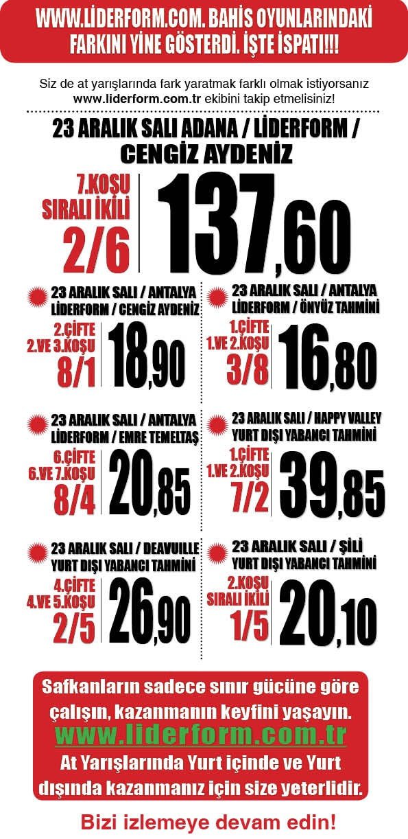 22 Aralık Pazartesi BURSA - ŞANLIURFA'da yapılan yarışlarda bir sonraki koşularında takip edilmesi gereken safkanlar