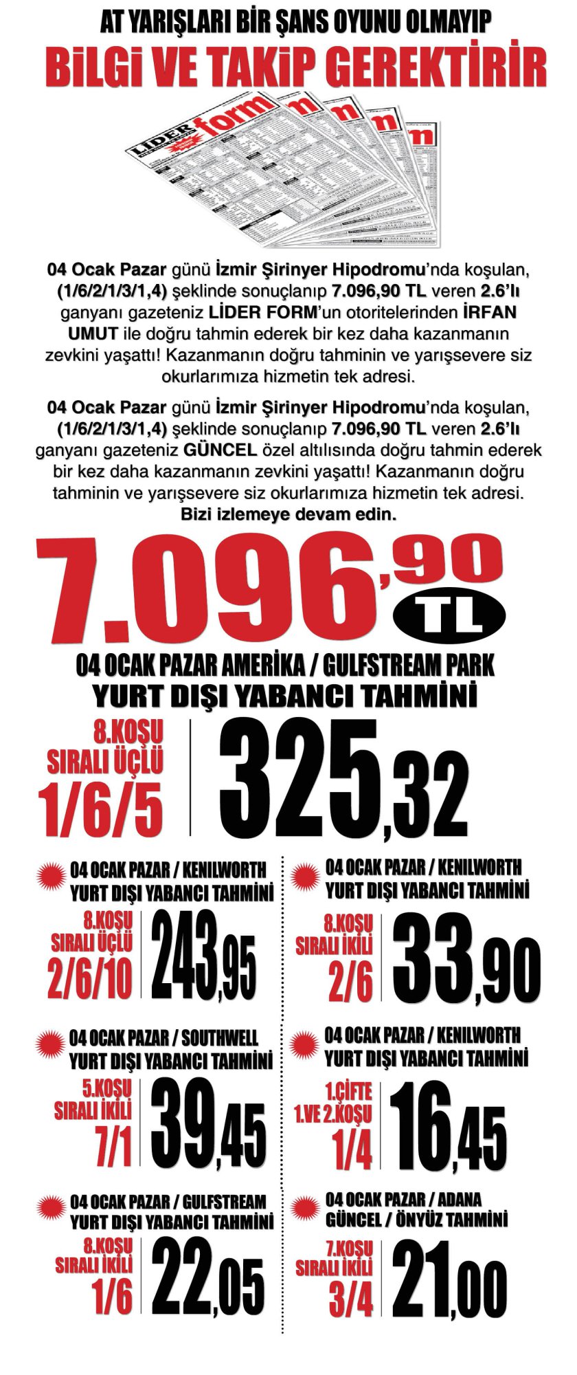 04 Ocak Pazar İZMİR - ADANA'da yapılan yarışlarda bir sonraki koşularında takip edilmesi gereken safkanlar