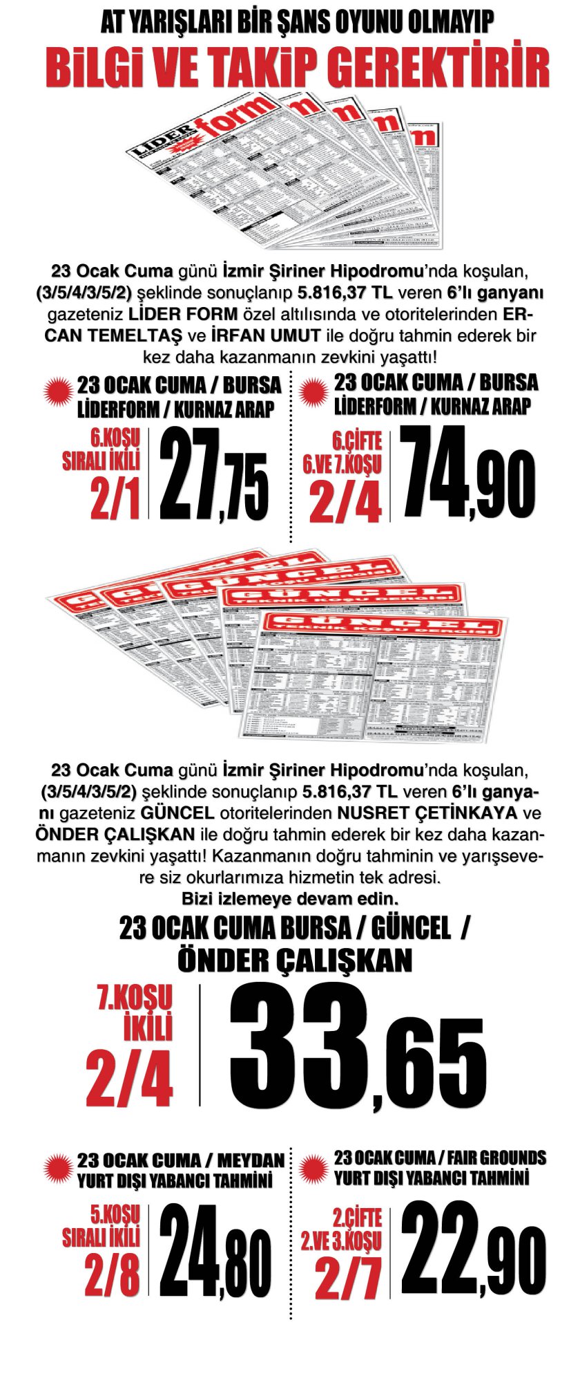 24 Ocak Cumartesi günü İstanbul’da 3.4.7. ve Adana’da 4.5.9. Koşuların analizleri yapıldı