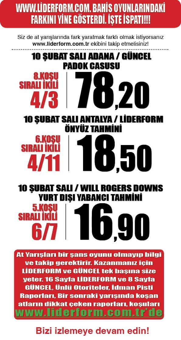 08 Şubat Pazar İSTANBUL - ADANA'da yapılan yarışlarda bir sonraki koşularında takip edilmesi gereken safkanlar