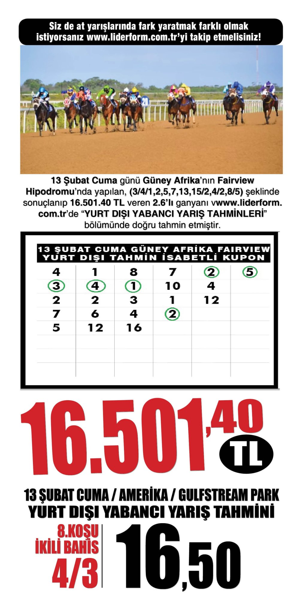 Sitemizin 13 Şubat Cuma GÜNCEL Yurt Dışı Yabancı Yarış Tahminleri