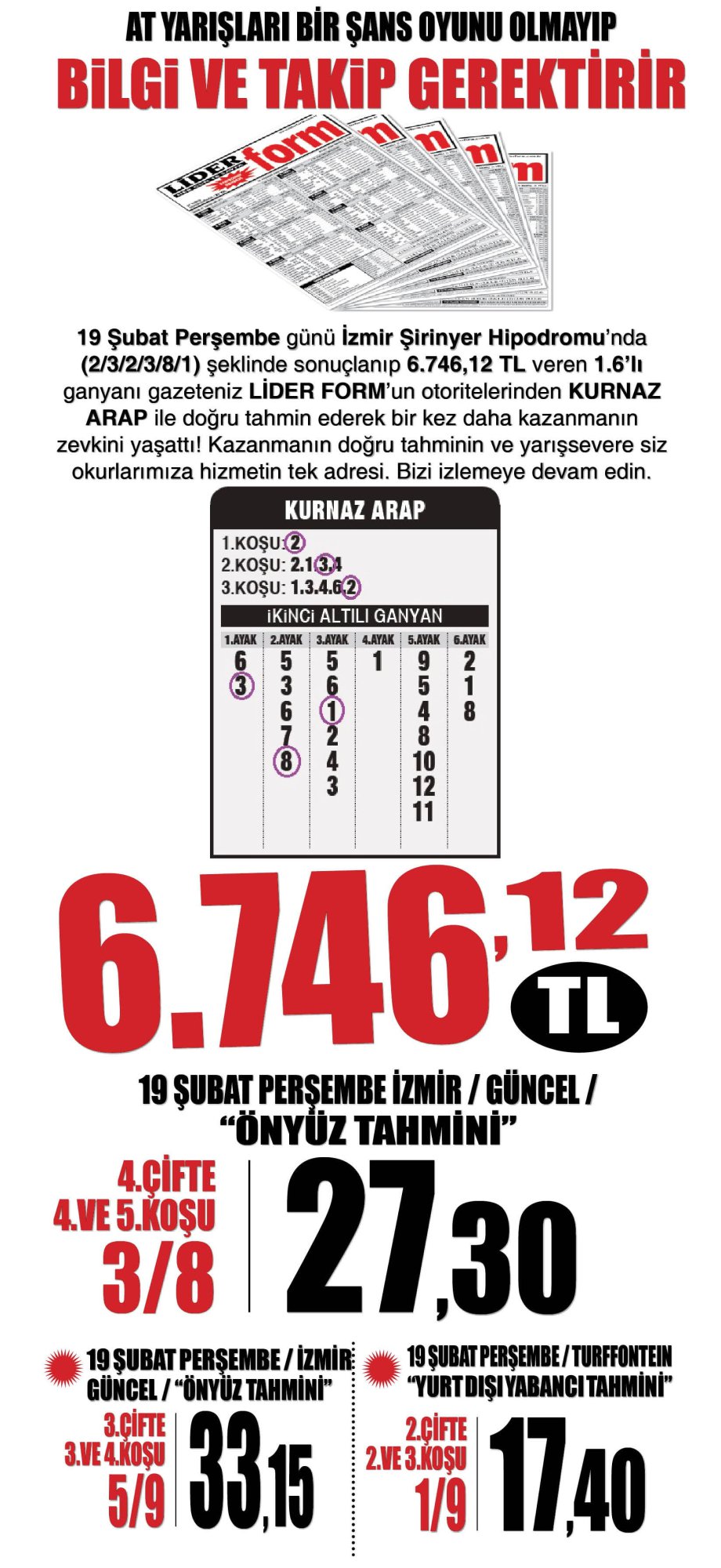 HürkontLİDERFORM Otoritesi Kurnaz Arap'tan 6.746,12 TL'lik İzmir 6'lısı