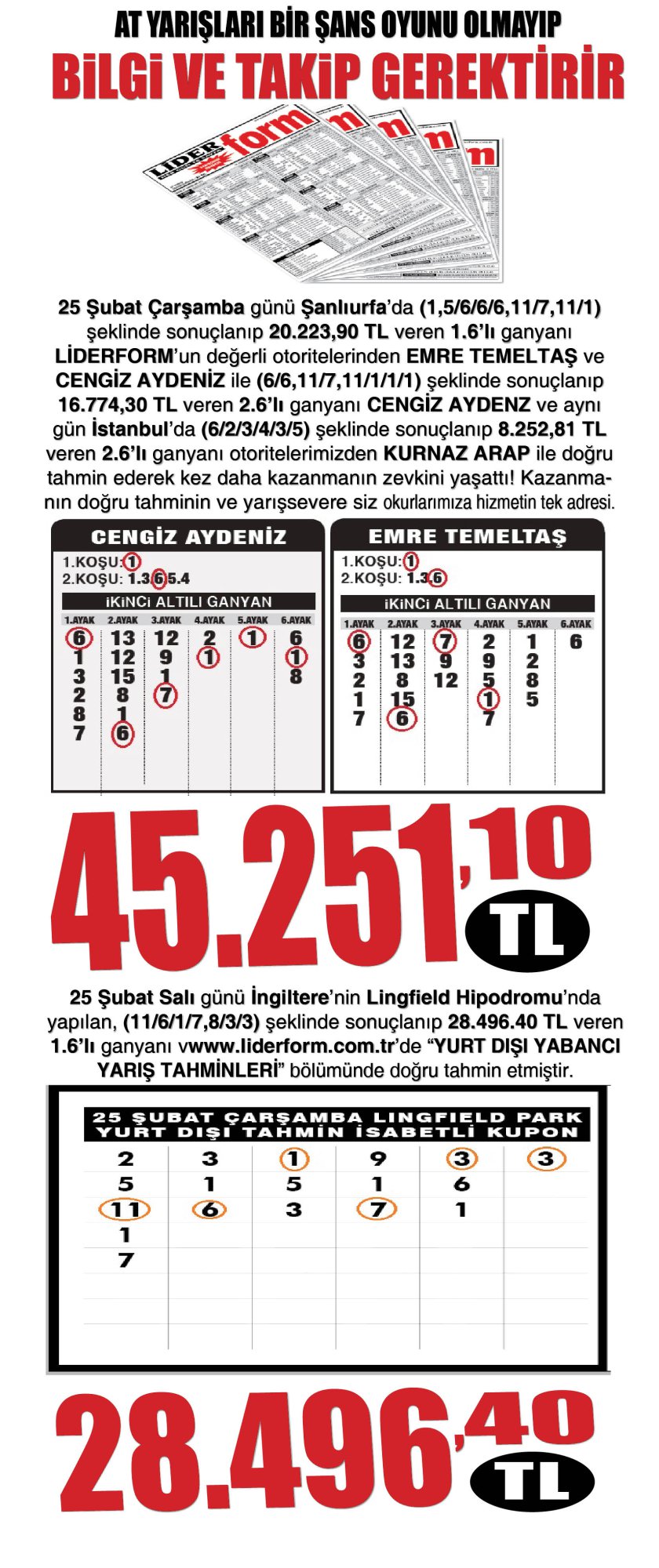 Hürkontİstanbul, Şanlıurfa ve Lıngfıeld'de sınır sistemiyle altılı Ganyan bulmaya devam ediyoruz