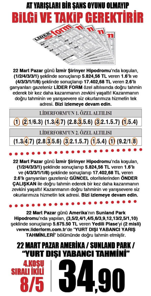 Sitemizin 22 Mart Pazar GÜNCEL Yurt Dışı Yabancı Yarış Tahminleri