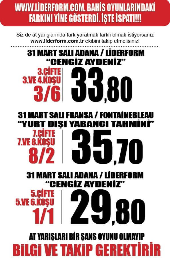 30 Mart Pazartesi BURSA - ŞANLIURFA'da yapılan yarışlarda bir sonraki koşularında takip edilmesi gereken safkanlar