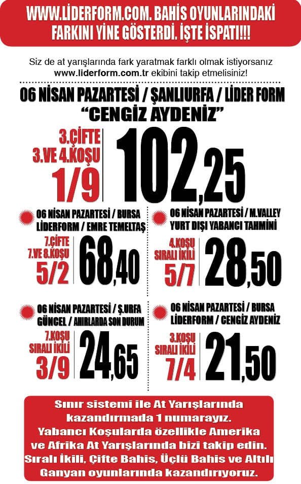 05 Nisan Pazar İZMİR - ADANA'da yapılan yarışlarda bir sonraki koşularında takip edilmesi gereken safkanlar