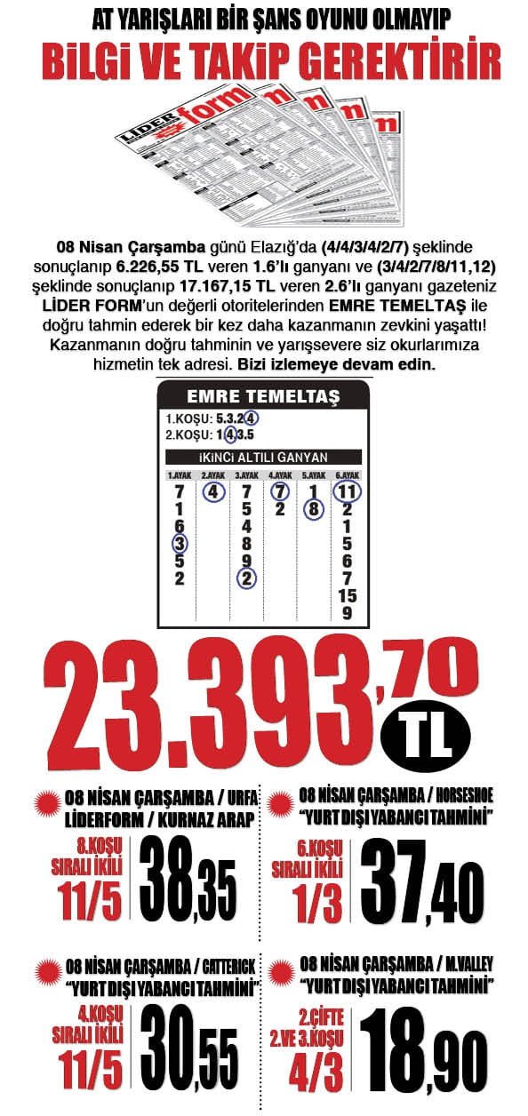 YarışlarLİDERFORM Uzmanlarından EMRE TEMELTAŞ'tan 23.393,70 TL'lik Urfa 6'lısı, Yurt Dışı Yarışlarında Cazip İkili ve Çifteler.