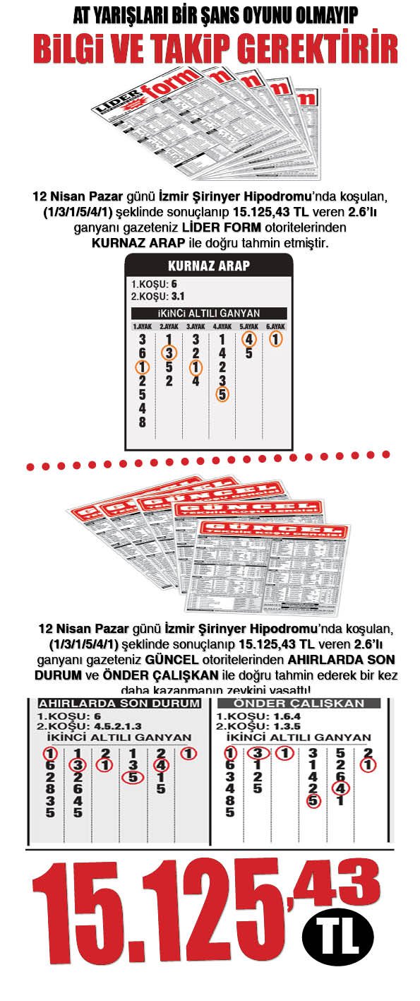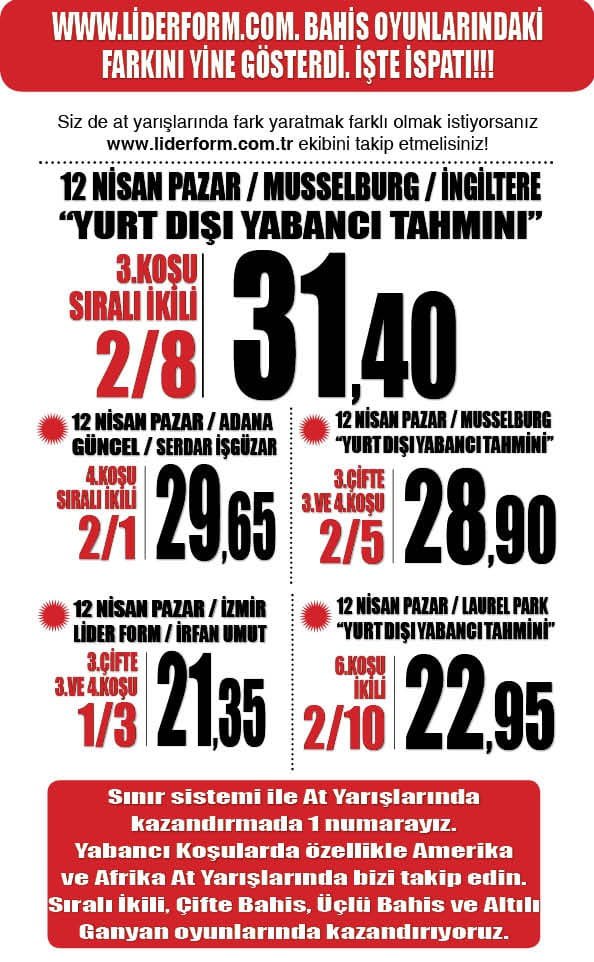 11 Nisan Cumartesi İSTANBUL - ADANA'da yapılan yarışlarda bir sonraki koşularında takip edilmesi gereken safkanlar