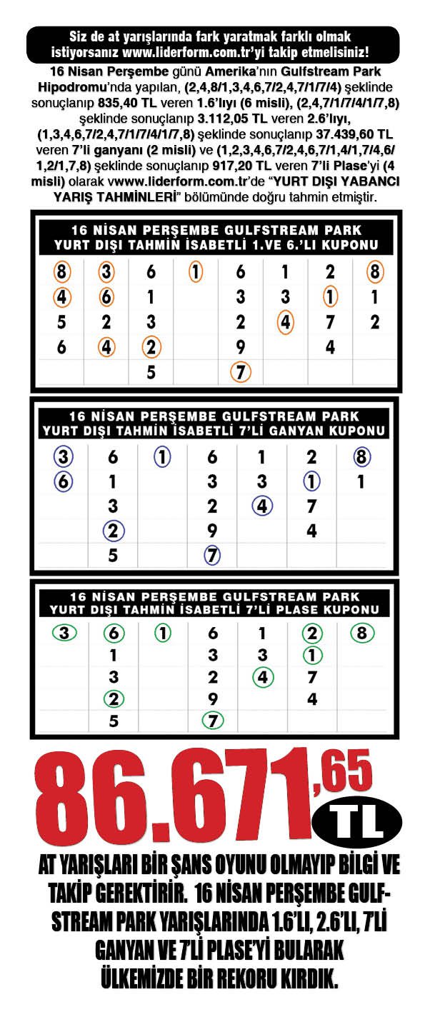 16 Nisan Perşembe Gulfstream Park Yarışlarında 1.6’lı, 2.6’lı, 7’li Ganyan Ve 7’li Plase’yi Bularak Ülkemizde Bir Rekoru Kırdık.