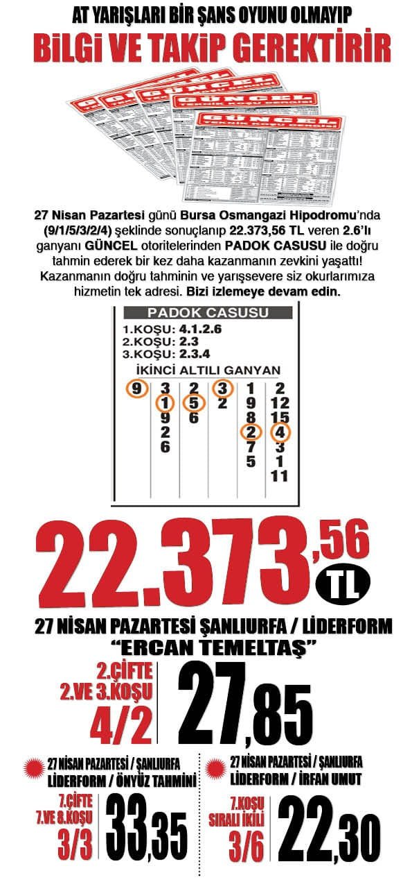 26 Nisan Pazar İSTANBUL - ADANA'da yapılan yarışlarda bir sonraki koşularında takip edilmesi gereken safkanlar