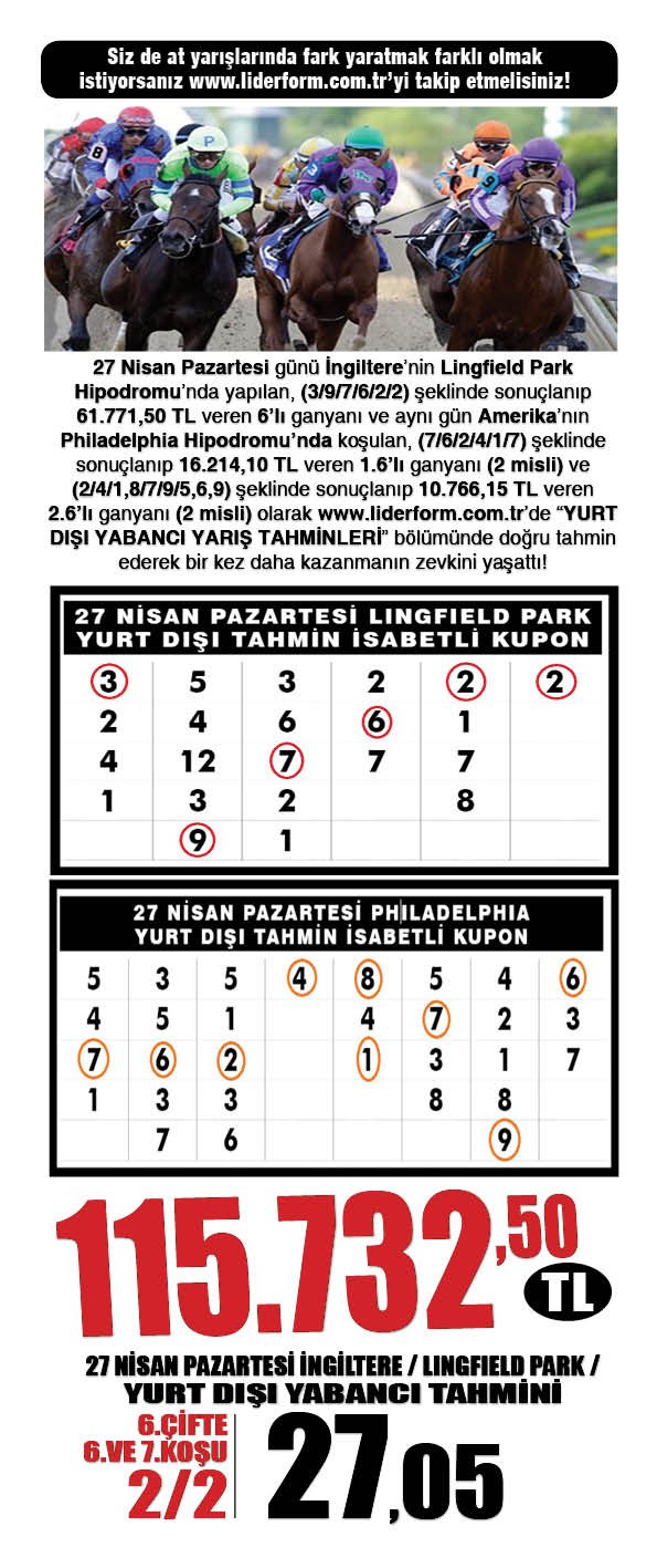 YarışlarAt Yarışlarında Güncel Bursa’da 2.6’lı, Yabancı koşularda Lingfield ve Philadelphia’da 6’lı ganyan bulduk. Kazandıŕmada Dünya’da 1 numarayız