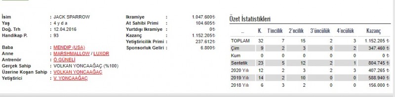 Merhum Asli Üyemizi andığımız mücadelede jokeyi Hışman Çizik ile start alan Jack Sparrow (Mendip - Marshmallow / Luxor) galibiyete uzandı. Volkan Yoncaağaç'ın sahibi ve yetiştiricisi olduğu, Ömer Güneli'nin antrene ettiği 4 yaşındaki doru erkek safkan, 8 koşuluk aranın ardından ilgililerine yeniden galibiyet sevinci yaşatırken, toplamdaki 7. birinciliğini elde etmiş oldu.