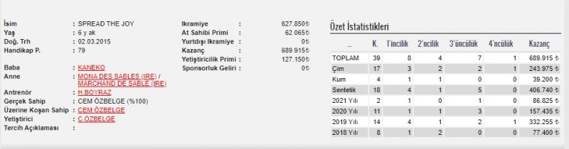 Yarışlar17 Mart Çarşamba günü İstanbul Veliefedi Hipodromu'nda yapılan 5.Koşu Gültekin Alpay koşusu KV-6 2000 metre sentetik pistte 8 safkan start alıp startla birlikte koşunun liderliğini HEVA aldı ikinci ARAGONA yedinci SENSİZİM sekizinci SPREAD THE JOY şeklinde karşı düzlükte bu sıralama ile geçildi yarışın temposu 400/0.27.50 - 0.39.88 - 800/0.52.32 - 1000/1.04.76 - 1200/ 1.16.93 - 1400/1.29.03 son viraj dönüldükten sonra ilk iki aynı olurken orta kulvardan son 400 den sonra SENSİZİM, SPREAD THE JOY ön tarafa doğru gelmeye başladı son 150 de iki safkan buluştu içte SENSİZİM dışında SPREAD THE JOY başa baş mücadelesinde fotaya yakın SPREAD THE JOY boyun farkıyla Efsane spiker GÜLTEKİN ALPAY koşusu'nu 2.04.91 ile Jokeyi Gökhan Kocakaya ile kazandı Son 800: 0.47.25 oldu. SENSİZİM 2.04.91 derecesi ile ikinci oldu