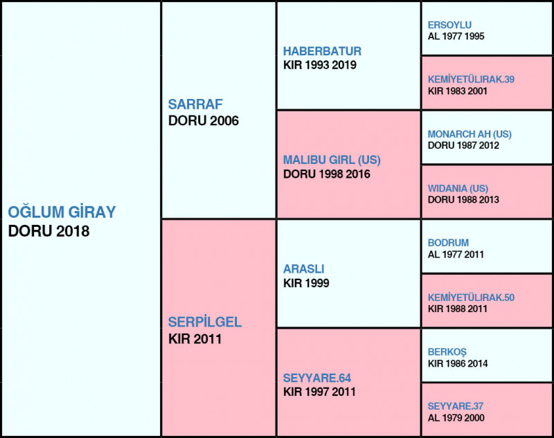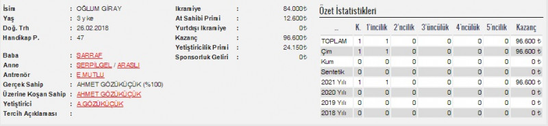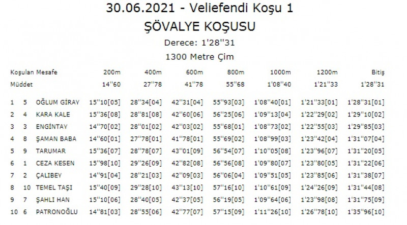 30 Haziran Çarşamba günü İstanbul Veliefendi Hipodromu’nda 1300 metre çim pistte yapılan, 3 Yaşlı Arap taylarına ait günün 1.Koşusu olan Şartlı-1 mücadeleye 10 tay katılım gösterdi. Koşunun liderliğini startla birlikte ilk 100 metrede ŞAMAN BABA aldı. ENGİN TAY ikinci, OĞLUM GİRAY bariyer dibinden kolay tempoda üçüncü, KARAKALE, 1000 startı geçilirken 4 atın boşluğundan dışırdan girdi. KARAKALE, rakiplerinden biraz fazla efor sarfedip fazla mesafe koştu. Yarışın ilk 400/0,27,78 – 600/0,41,78 – 800/0,53,68 ile geçildi. Son viraj dönüldükten sonra koşunun liderliğini yapan ŞAMAN BABA orta kulvarı tercih edince bariyer dibi boş kalınca OĞLUM GİRAY araya girdi. Son viraj dönüldükten sonra KARA KALE sprint yapacağı bariyar dibinden güzel sprintiyle binicisi safkanı atağa kalkdırdığı anda OĞLUM GİRAY safkanın kulvarına girdi. Binicisi atını tutmak zorunda kalıp önünde iki atın daha olması ile M.Çiçek atını tutarak 3 atın dışına tayı almak istedi. Son 300’de bariyer dibine yakın liderliği alan pisti son 200’den sonra OĞLUM GİRAY biraz ortalayıp farkı açarak 5 boy fark yaparak atı alan Üsküdar’ı geçti deyimi ile 1000/1,08,40 – 1200/1,21,33 – 1400/1,28,28 ile geçildi. OĞLUM GİRAY, koşuyu 1,28,28’lik derecesi ve jokeyi Hışman Çizik ile kazanma başarısını gösterirken, son 800: 0,53,07 oldu. Aynı gün diğer Şartlı-1’i kazanan ÇAKIL’ın 1,28,53’lük derecesinden daha iyi bir derece yapması ile ilk yarışında kesinlikle ihmal edilmemelidir. KARA KALE, koşu içerisinde startla birlikte yaşanan talihsizlerle son 500’den bariyer dibinden sprinte kalkacağı anda önünü OĞLUM GİRAY kapatması bu şartla koşuyu 2.bitirirken, fotoya mermi gibi girdi. Yarıştaki bitiriş derecesi 1,29,06 olmasını kesinlikle ölçü almayın. İlk yarışında Maiden’dan çıkacak güçe sahip olup kesinlikle ihmal edilmemeli. OĞLUM GİRAY’ın kazanmasına katkı yapanları tebriz ederiz.