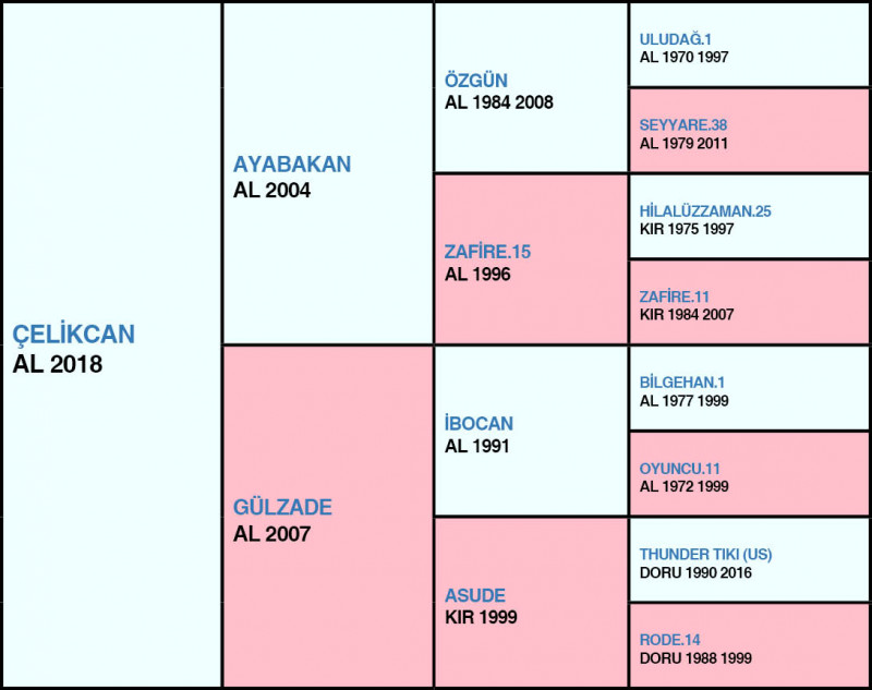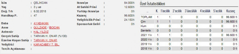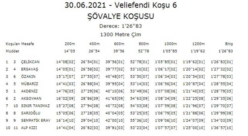 30 Haziran Çarşamba günü İstanbul Veliefendi Hipodromu’nda 1300 metre çim pistte yapılan, 3 Yaşlı Arap taylarına ait günün 6.Koşusu olan Şartlı-1 mücadeleye 10 tay katılım gösterdi. Startla birlikte ÇELİKCAN koşunun liderliğini aldı. Bariyer dibinden jokeyinin kontrolünde gidip dışında ERSAVAŞ vardı. Son 600’e kadar başa baş geldi. Daha sonra ÇELİKCAN rakibinden kurtulup liderliği aldı. Son viraj dönülürken, farkı da bir anda 2 boya çıkarttı. İlk 400/26,54 – 600/39,56 – 800/52,78’lik tempolarla son 500 startı geçildi. Son 200’den sonra dışında olan ERSAVAŞ ile aradaki farkı daha ada açarak 3 boya çıkarttı. 1000/1,06,85 – 1200/1,19,02 ile geçildi. ÇELİKCAN (Ayabakan- Gülzade / İbocan) orijinli tay, 1,26,80’lik derecesi ve jokeyi Mehmet Kaya ile kazanma başarısını gösterirken, son 800: 0,53,38 oldu. Aynı gün diğer Şartlı-1’i kazanan OĞLUM GİRAY’ın 1,28,26 ve ÇAKIL’ın 1,28,53’lük derecelerinden daha iyi bir derece yapması ile ben farklı bir kumaşım işaretlerini bırakmıştır. Allah ayaklarını düz bastırsın. Yol boyu dışından kovalayan ERSAVAŞ (Uçanoğlu- Derincan / Anadolu Ateşi) orijinli tay, 1,27,31’lik derecesi ile koşuyu 2.bitirirken, aynı gün diğer Şartlı-1’i kazanan OĞLUM GİRAY’ın 1,28,26 ve ÇAKIL’ın 1,28,53’lük derecelerinden daha iyi bir derece yapması ile ilk Maiden yarışında kesinlikle ihmal edilmemelidir. ÖZAKIN (Özgünhan- Nursevil / Sülo) orijinli tay, son virajı jokeyinin teşviki ile 6.durumda dönmesine rağmen son 400’de safkanların dışına açılarak yapmış olduğu güzel sprinti ile yarışı 3.bitirirken, birinci ve ikinci ile arasında 1 boy fark verdi. Koşunun temposu 200/15,07 (7) - 400/27,55 (7) – 600/40,48 (7) – 1000/1,06,34 (3) – 1200/1,20,54 (3) – 1400/1,27,44 (3) olup güçlü bir tay izlenimini bırakırken, 1,27,44’lük derecesi ile aynı gün diğer Şartlı-1’i kazanan OĞLUM GİRAY’ın 1,28,26 ve ÇAKIL’ın 1,28,53’lük derecelerinden daha iyi bir derece yapması ile ilk Maiden yarışını zorlanmadan kazanacak kalitede bir tay olduğunu belirtebiliriz. ÇELİKCAN’ın kazanmasına katkı yapanları tebriz ederiz.