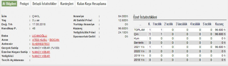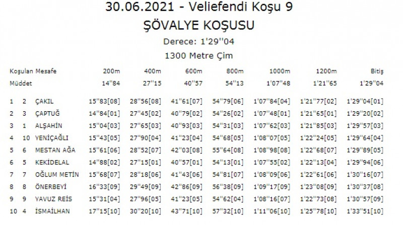 30 Haziran Çarşamba günü İstanbul Veliefendi Hipodromu’nda 1300 metre çim pistte yapılan, 3 Yaşlı Arap taylarına ait günün 9.Koşusu olan Şartlı-1 mücadeleye 10 tay katılım gösterdi. Start verildikten 150 metre içinde bariyer dibinden liderliği KEKİ DELAL alıp farkı 2 boya çıkarttı. İkincilikte ÇAPTUĞ, üçüncü ALŞAHİN ve ÇAKIL yedinci durumda son 600 startı geçildi. Son viraj dönülürken safkan dolu kantarmada kolay bir şekilde 2 atın dışından döndü. Koşunun başından itibaren KEKİ DELAL temposu yükseltti. 400/27,15 – 600/40,57 – 800/0,51,13 ile geçildi. Son viraj dönülüp KEKİ DELAL’a son 300’e kadar lider gelip daha sonra dama demesi ile birlikte ÇAPTUĞ liderliği alarak 1000/1,07,48 ile geçildi. Son 200’den sonra içte ÇAPTUĞ, dışında ÇAKIL birincilik mücadelesiyle 1200/1,21,65 ile geçildi. Son 50’de liderliği ÇAKIL, rakibi ÇAPTUĞ’dan alıp 1 boy farkla koşuyu 1,28,53’lük derecesi ve jokeyi Özcan Yıldırım ile bütünleşerek kazanma başarısını gösterirken, son 800: 0,53,91 oldu. ÇAPTUĞ (Son Martı- Çillikız / Rikardo), ön tarafa erken gelip son 50’de liderliği vermesine rağmen 1,28,70’lik derecesi ile ile ilk yarışında acele etmeyip sprint mesafesini kısaltması halinde çok daha farklı koşacak olup dikkat diyoruz. MESTAN AĞA (Ufukbir- Arzuhanım / Batyskaf (Pl)), son 400’de 8.durumda olmasına rağmen önünde atlı bir set olması safkanlarının hepsinin dışına alarak oldukça zaman kaybederek son 200’de de 7.durumda olmasına rağmen yapmış olduğu müthiş sprinti ile yarışı 5.bitirirken, fotoya 1., 2., 3.ve 4.olan taylardan daha canlı girmesi ile ilk yarışında daha farklı koşacak olup dikkat diyoruz. ÇAKIL'ın kazanmasına katkı yapanları tebriz ederiz.