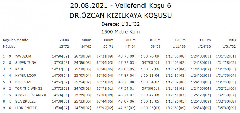 20 Ağustos Cuma günü İstanbul Veliefedi Hipodromu'nda yapılan Dr. Özcan Kızılkaya Koşusu 1500 metre sentetik pistte 9 Safkan katıldığı koşuda koşunun lıderliğini TOR THE WINGS alarak yüksek tempoda yarışı ön tarafta forse eden safkan son vıraj dönüldükten sonra kendisi 1200 startından itibaren kovalayan LION EMPIRE ile birlikte ilk 600/35.71 - 800/0.47.54 - 1000/0.59.69 1200/1.11.89 geçilince son vırajı 10'ıncı durumda bekleme yarışı yapan YAVUZCA dönmesi son 100 de TOR THE WINGS dama derken safkanların dışında altıncı durumda olup uçarak gelerek 1.5 boy fark 1.31.34 derecesinle Jokeyi M.Bayır ile koşuyu kazandı son 800:0.48.40 oldu. Kazanmasına katkı yapanları tebrik ederiz. Koşuyu dördüncü bitiren HYPER LOOD trafik sorunu yaşaması koşuyu ikinci bitirebilirdi. Koşuyu beşinci bitiren BIG PRIZE son 30 metrede trafik sorunu yaşaması sıralamadaki yerini kaybetti ve beşincilikle yetindi. İlk yarışında çok daha farklı koşacaktır.