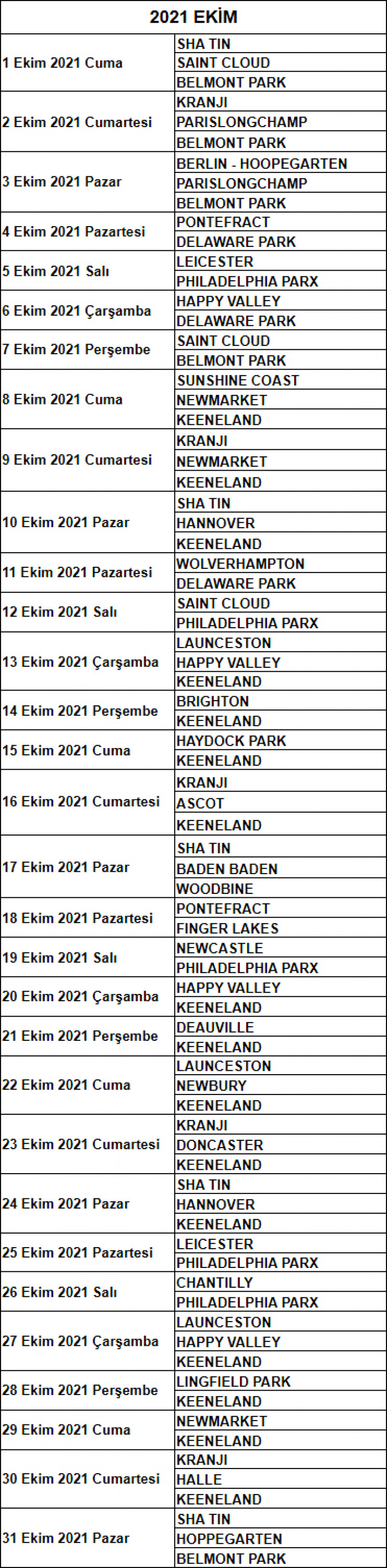 Ekim ayı yurt dışı yarış takviminde; Amerika, İngiltere, Fransa, Hong Kong, Kanada, Almanya, Singapur ve Avustralya'dan 77 yarış programı alınarak, bu koşular üzerine müşterek bahis kabulü yapılması planlanmaktadır. Ekim ayında yurt dışı yarış günlerinden, 30'u Amerika, 15'i İngiltere, 9'u Hong Kong, 7'si Fransa, 6'sı Almanya, 5'i Singapur, 4'ü Avustralya ve 1'i ise Kanada olmak üzere toplam 77 yarış programı ekranlarınıza taşınacaktır.