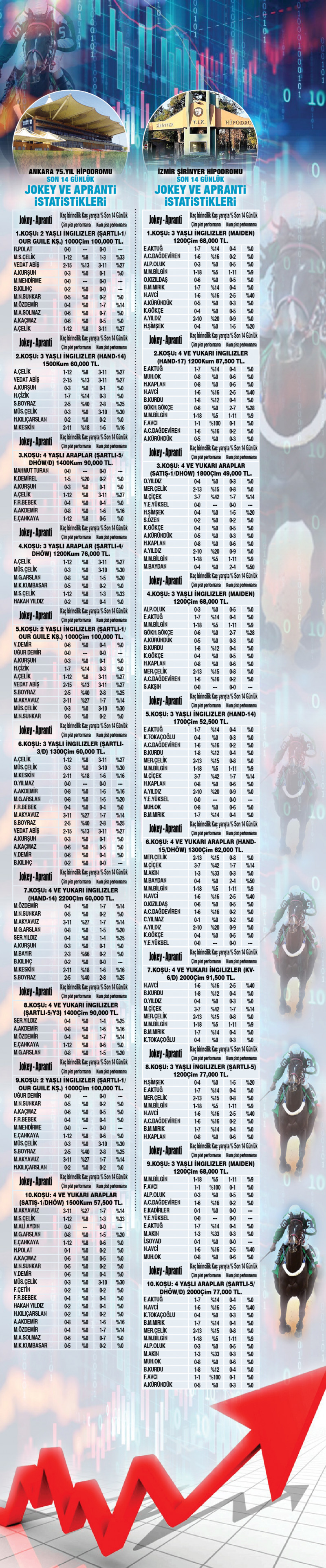 09 Haziran 2022 Perşembe günü Ankara ve İzmir'de start alacak jokey ve aprantilerin son 14 günlük performans istatistikleri